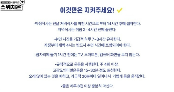 박용우 박사가 제안한 스위치온 다이어트는 체내 지방 대사 스위치를 켜 체지방을 에너지원으로 활용하는 프로그램입니다. 단순한 저칼로리 식단이 아니라, 대사 활성화에 초점을 맞춰 효과적인 감량을 가능하게 합니다.