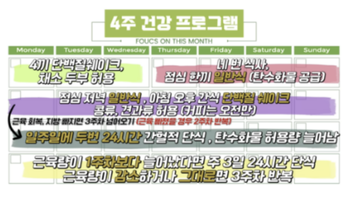 | 4주차 | 3주차보다 근육이 늘고 지방이 빠졌다면 주 3회 24시간 단식 실시, 근육 회복이 안 될 경우 3주차 일정 반복 |