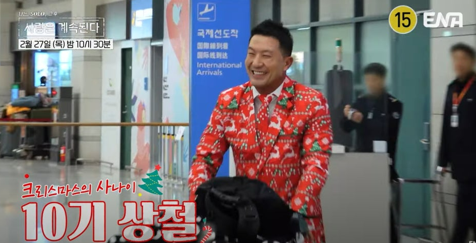 22기 정숙은 빨간 드레스와 루돌프 머리띠를 하고 공항에서 상철을 기다렸습니다.