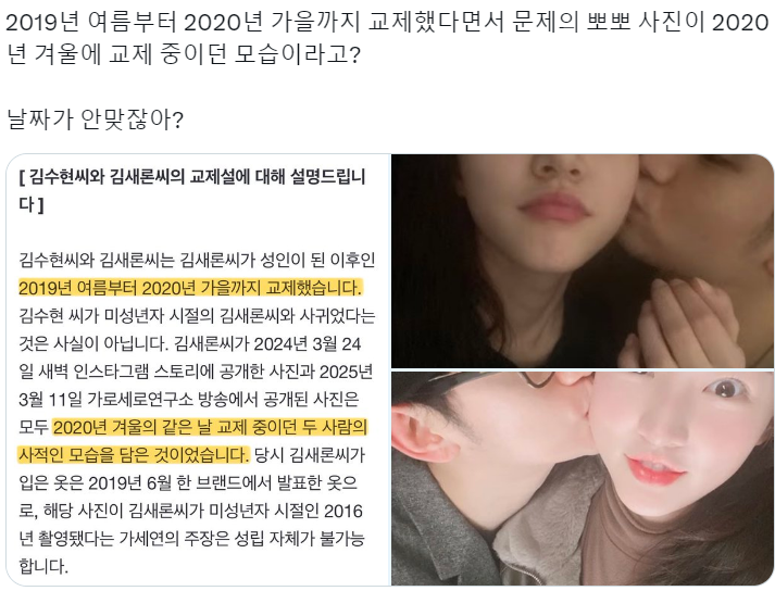 소속사에 따르면, 김수현 씨와 김새론씨는 김새론 씨가 성인이 된 이후인 2019년 여름부터 2020년 가을까지 교제했다고 밝혔습니다. 특히, 논란이 된 사진들에 대해 소속사는 해당 사진들이 2020년 겨울에 촬영되었으며, 김새론 씨가 착용한 의상이 2019년 6월에 출시된 제품임을 근거로 들며, 미성년자 시절의 사진이라는 주장을 반박했습니다.